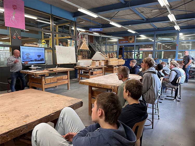 Wiebe begint zijn gastles met een persoonlijk verhaal. Hij beschrijft hoe hij met niets is begonnen. Door zijn vader en broer meegenomen in het timmervak en vervolgens zelf alle benodigde kennis en kunde vergaard heeft en zich het bouwproces eigen gemaakt.